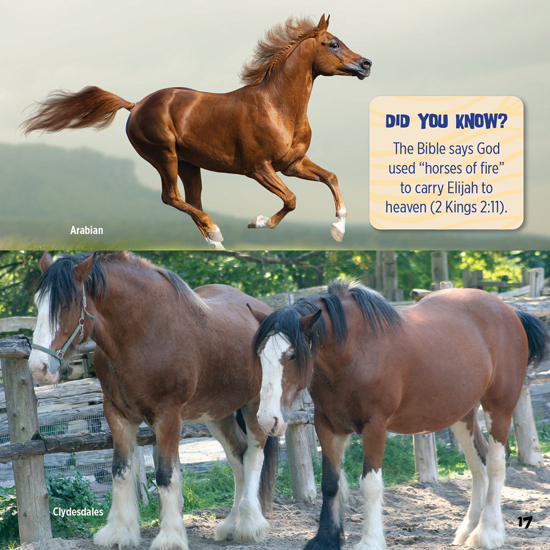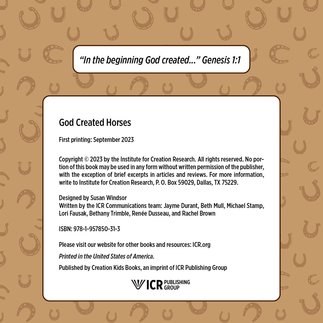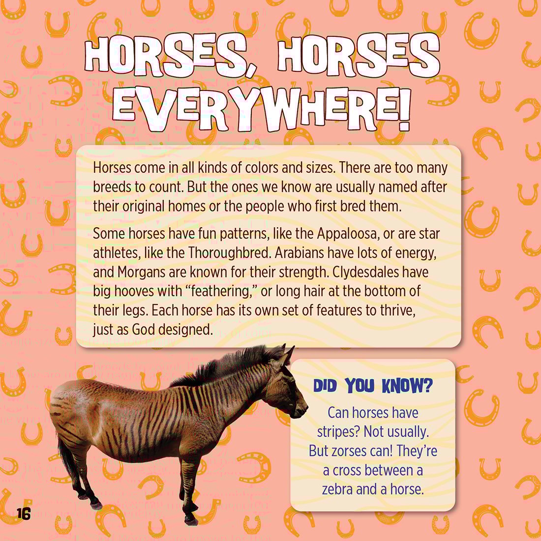 In God Created Horses, you'll learn about the incredible abilities that make horses so special. How fast can horses run? Do they ever have stripes? And why do some wear shoes? Saddle up and explore how these beautiful features and more point to the marvelous design of our Creator and Savior, the Lord Jesus Christ.